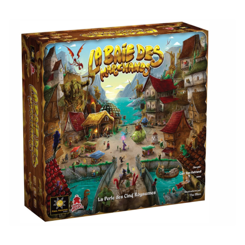 La Baie des Marchands est un jeu de gestion hautement asymétrique où chaque joueur assume le rôle d’un marchand spécifique avec une boutique unique. Les marchands sont en concurrence durant 3 jours (manches) pour vendre leurs marchandises aux aventuriers qui arrivent sur les quais de la ville, un endroit où se trouvent les marchés les plus célèbres des Cinq Royaumes.Chaque joueur utilise son propre ensemble de composants (matériel et plateau individuel) et des mécanismes de jeu spécifiques propre à son rôle pour produire ses marchandises, augmenter l’efficacité de sa boutique, faire évoluer son équipe et, surtout, devenir riche !Bien que les marchands travaillent de manière indépendante dans leur magasin spécialisé, ils se font concurrence pour attirer des clients, influencer la demande de marchandises et obtenir des parrainages des quatre halls de faction.Pour avoir un avantage, les commerçants peuvent employer des citadins locaux pour travailler dans leur magasin en tant que personnel. Et s’ils osent, ils peuvent tirer parti du repaire corrompu des voleurs – mais à quel prix? Après trois jours de vente sur les marchés, le marchand le plus riche sera déclaré le Roi des marchands !Le jeu de base est fourni avec le plateau de la baie (ville, habitants, 6 bateaux pour les clients) et 4 marchands de départ (L’Alchimiste, la Capitaine, le Forgeron, Le Chronomancien) avec chacun, une figurine et tout le matériel, plateau et éléments 3D, pour produire ses marchandises !La boite contient également un mode solo avec un joueur IA : Le Colporteur, qui peut également faire office de 3ème joueur dans une partie à 2.Une vidéo pour découvrir le jeu:https://youtu.be/0t0wtqIZAYg